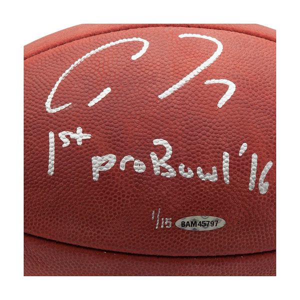 The 2015 season marked the league-wide arrival of Allen Robinson. While fans of Penn State and the Jaguars had been well aware of the immense talent of the speedy wide receiver, the rest of the NFL got to see what those fans had been raving about. Namely, Robinson is one of the league's top playmakers. He hauled in 80 catches for 1,400 yards and 14 touchdowns, which were more than good enough for him to earn his first trip to the Pro Bowl. He had two catches for 105 yards, including a 50-yard touchdown from Vikings QB Teddy Bridgewater. Wearing a jersey number not normally reserved for wide receivers, Robinson sports #15 for the Jaguars. To commemorate his first Pro Bowl selection, UDA produced just 15 of these inscribed footballs. Robinson has signed and inscribed "1st Pro Bowl '16" on this limited edition (15) NFL Duke football in silver paint pen. His signature is deemed authentic by virtue of Upper Deck Authenticated's Five Step Process.