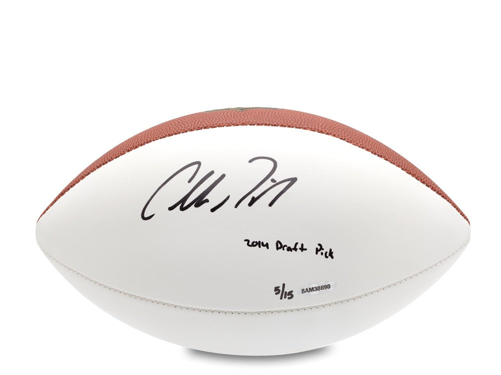 The Jacksonville Jaguars selected All-American wide receiver Allen Robinson out of Penn State University in the 2nd round of the 2014 NFL draft. Known for his good hands, route running, and run-after-the-catch ability Robinson was the team's leading and most targeted receiver before a stress fracture in his foot caused him to miss the remainder of the season. Allen will be a key offensive component in the revitalization of the Jacksonville franchise moving forward. Robinson has signed and inscribed this limited edition (15) white paneled Wilson football "2014 Draft Pick" in black paint pen. His signature and inscription are deemed authentic by virtue of Upper Deck Authenticated's Five Step Process.
