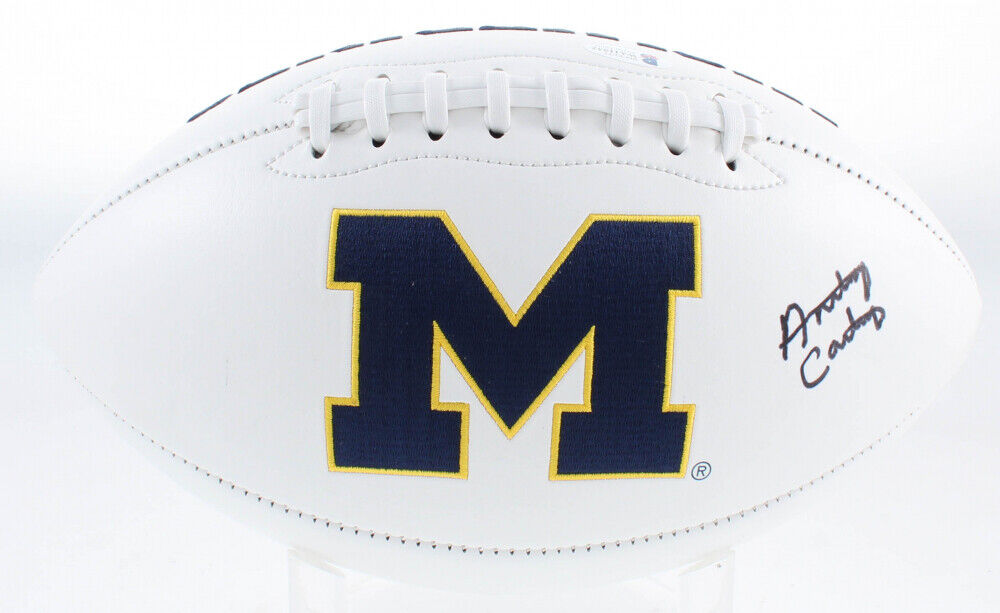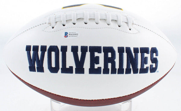 Michigan Wolverines logo football has been hand-signed in black felt-tip pen by Anthony Carter. The lot / autograph(s) includes an official Beckett Authentication Services serially-numbered hologram and matching COA for authenticity purposes. The signing of this item was witnessed by Beckett.Authentication: Beckett COA