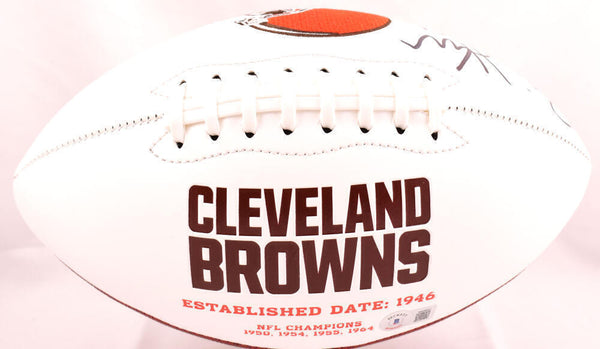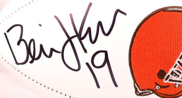 Bernie Kosar Autographed Cleveland Browns Logo Football - Beckett W Hologram *Black This is a Hand Autograph of Bernie Kosar on a Cleveland Brown Logo Football. This item has a Beckett Witness Authentication, which comes with a Beckett numbered sticker and a QR code for verification. You can view this item on the Beckett Authentication website, it shows when and where the item was signed. It was signed either at a public autograph appearance or a private signing. This is a stock photo of the item. Although you may not receive this exact item, the item you receive is virtually identical and brand new in great shape.