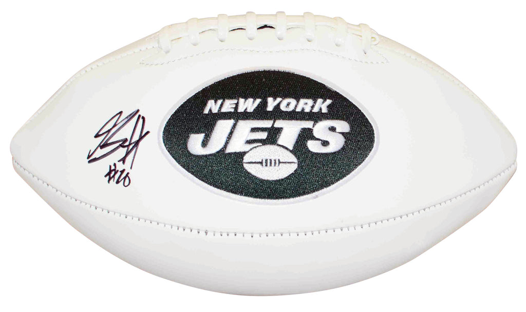 Breece Hall, star running back for the New York Jets, has hand signed this Jets white panel logo football at a private signing. This item comes with a serial-numbered hologram from Fanatics Authentic, one of the leaders in the industry. The authenticity can be verified online by entering the serial-number. A Fanatics Authentic information card is also included.Item pictured may not be the exact item you will receive. It will be similar quality, and we guarantee your satisfaction.