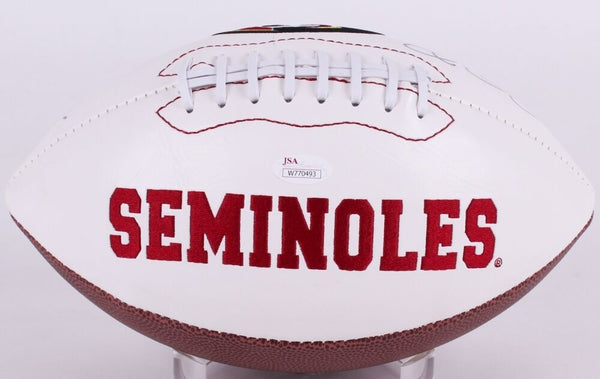 Florida Seminoles Full Size Logo Football. Hand-signed and inscribed in black felt-tip pen by Chris Weinke (Panthers). The autograph includes an official James Spence Authentication (JSA) hologram and matching COA for authenticity purposes. The signing of this item was witnessed by JSA.Authentication: JSA COA