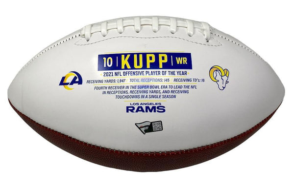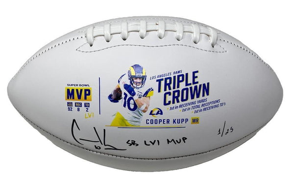 This Triple Crown commemorative white panel football has been personally hand-signed by Cooper Kupp with the added inscription "SB LVI MVP." It is officially licensed by the National Football League and comes with an individually numbered, tamper-evident hologram from Fanatics Authentic. To ensure authenticity, the hologram can be reviewed online. This process helps to ensure that the product purchased is authentic and eliminates any possibility of duplication or fraud.This football is limited to just 25 and you are bidding on number "1" from the edition.The autograph includes an official Fanatics hologram and matching COA for authenticity purposes.Comes with a tamper-evident hologram from Fanatics AuthenticatedOfficially licensed by the NFL MONEY BACK GUARANTEE! If for any reason you are not completely satisfied with the quality or authenticity of your purchase, we will gladly give you a full refund or exchange, whichever you prefer up to 30 days after purchase. Please feel free to e-mail us with any questions. Thank you. Authenticator Pre-Certified Authenticator: Fanatics Authenticated History of item: Cooper Kupp has signed this item in the presence of a representative from Fanatics. Describe how you came to possess this item: Super Sports Center is a fully authorized dealer for Upper Deck Authenticated as well as Mounted Memories and Steiner Sports. Other information about you and / or the item: Super Sports Center strives to deliver the most authentic in sports memorabilia from trusted companies like Mounted Memories, Steiner Sports and Upper Deck Authenticated. If it exists, we can find it for you!