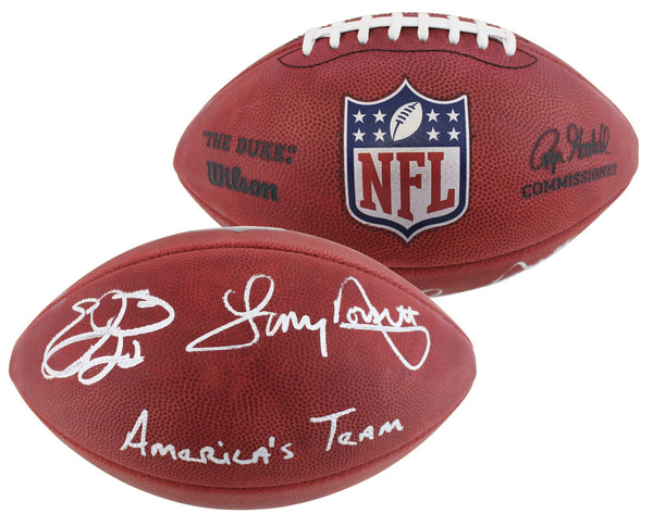 This Autographed Official Wilson "The Duke" Nfl Football with the inscription of "America's Team (Dorsett)" has been Personally Signed by Tony Dorsett & Emmitt Smith of the Dallas Cowboys. This item is 100% Authentic to include a hologram by Beckett Authentication Services. This item will come with the new Beckett Authentication hologram that has a scannable QR code rather than the traditional COA. If you would like to have a COA, you are welcome to reach out to Beckett for a printed certification once you receive your item. This is a BAS Witnessed Protection Program item which means a Beckett Authentication Service representative was present when this item was being signed. We conducted an autograph signing with Tony Dorsett & Emmitt Smith where multiples of the same item were signed. While the photographs are representative of this item, the size, placement and strength of the signature may vary. Each item is hand signed, therefore, each autograph is unique. This item can be verified through BAS Witnessed.