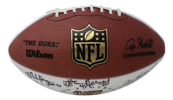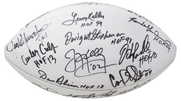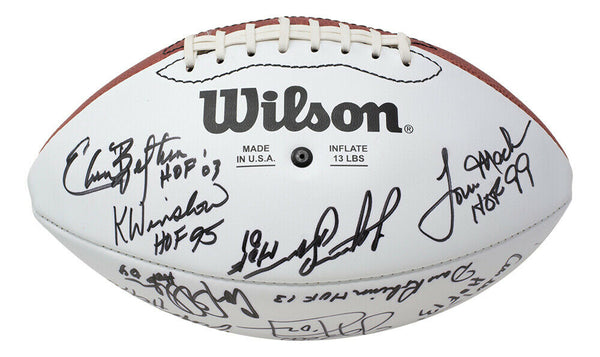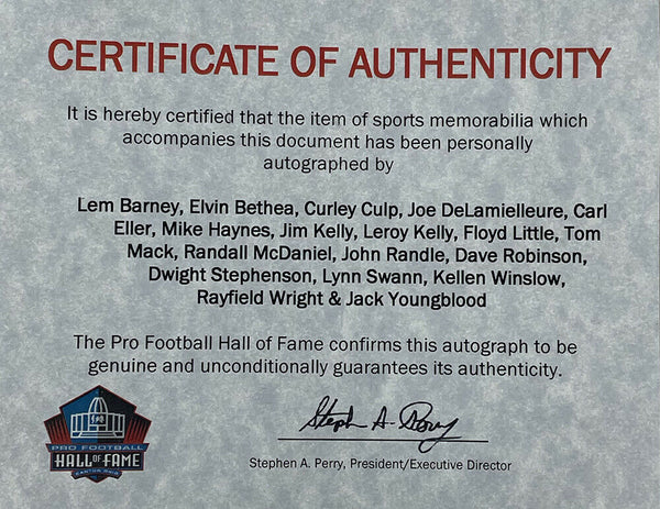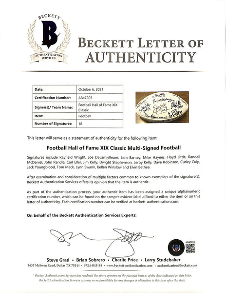 Featured is a Football Hall of Fame XIX golf classic multi signed football. This football was hand signed by 18 players and has been authenticated by Beckett authentication services. Included with the football is a Beckett hologram and certificate of authentication. This item would make a great addition to any sports memorabilia collection! SPECIFICATIONS Autographed By: Jim Kelly Team: Sport: Football Authentication: Professional Sports Authenticator (PSA)