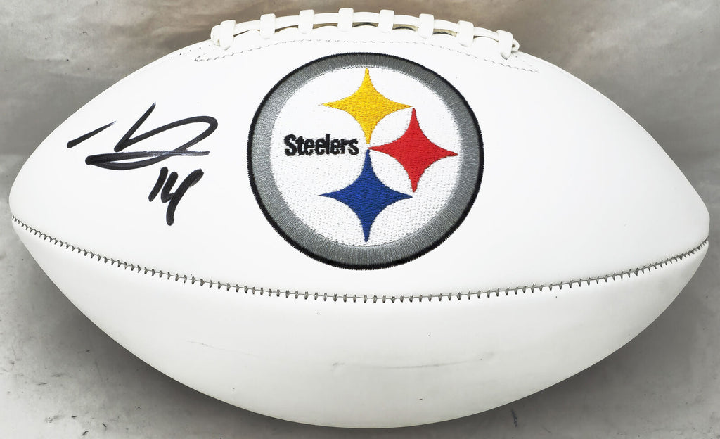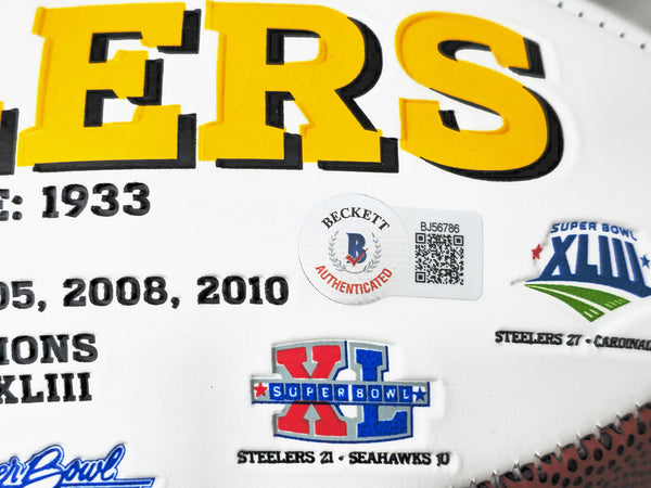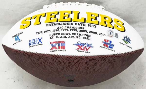 This is an Official Pittsburgh Steelers White Logo Football that has been hand signed by George Pickens. This item has been certified authentic by Beckett Authentication (BAS) and comes with their tamper-proof QR Code hologram that can be verified on the Beckett-authentication.com.
