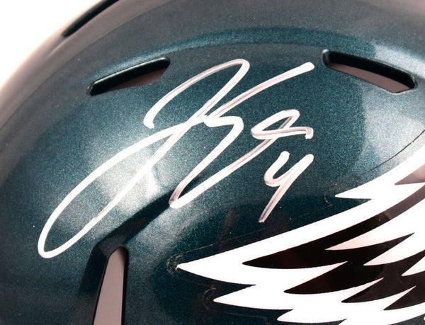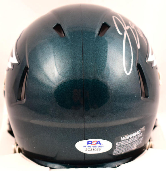 Jake Elliott Autographed Philadelphia Eagles Speed Mini Helmet - PSA *Silver This is a hand autograph of Jake Elliott on a Philadelphia Eagles Speed Mini Helmet. This item has a PSA In the Presence Authentication, which comes with a PSA numbered sticker hologram and matching PSA Certificate of Authenticity. You can view this item on the PSA website, it shows when and where the item was signed. It was signed either at a public autograph appearance or a private signing. This is a stock photo of the item. Although you may not receive this exact item, the item you receive is virtually identical and brand new in great shape.
