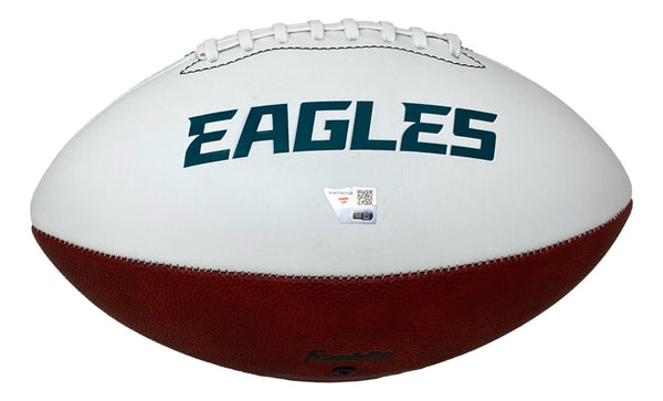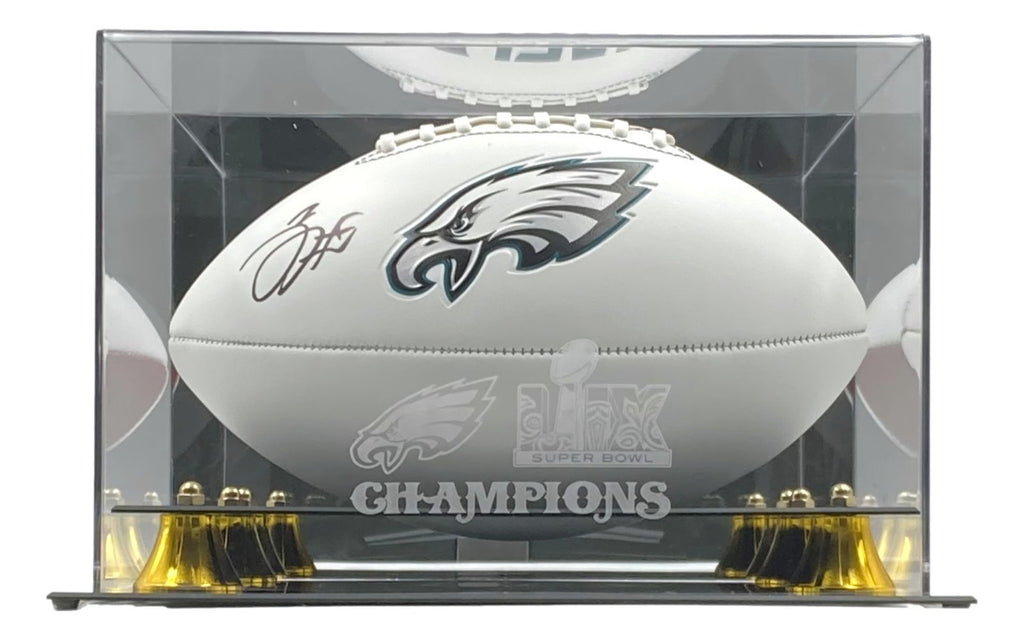 Featured is a Jalen Hurts signed Philadelphia Eagles logo football. This ball has been hand signed by Hurts and comes with the Fanatics hologram and certificate of authenticity. Included with this ball is a Super Bowl 59 logo deluxe acrylic display case. This ball would make a great addition to any sports memorabilia collection!. SPECIFICATIONS Autographed By: Jalen Hurts Team: Philadelphia Eagles Sport: Football Authentication: Fanatics Authentic