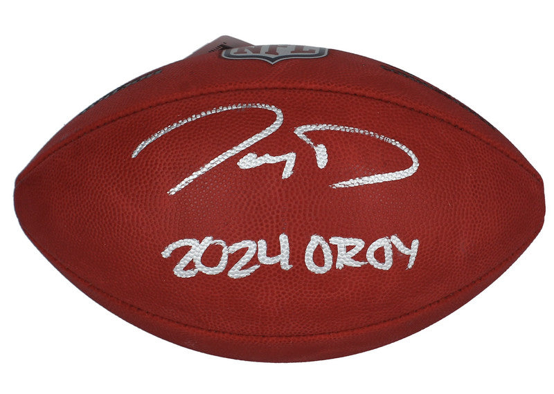 This football has been personally hand-signed by Jayden Daniels with the added inscription "24 OROY." It is officially licensed by the National Football League and comes with an individually numbered, tamper-evident hologram from Fanatics Authentic. To ensure authenticity, the hologram can be reviewed online. This process helps to ensure that the product purchased is authentic and eliminates any possibility of duplication or fraud.The autograph includes an official Fanatics hologram and matching COA for authenticity purposes.Comes with a tamper-evident hologram from Fanatics AuthenticatedOfficially licensed by the NFL MONEY BACK GUARANTEE! If for any reason you are not completely satisfied with the quality or authenticity of your purchase, we will gladly give you a full refund or exchange, whichever you prefer up to 30 days after purchase. Please feel free to e-mail us with any questions. Thank you. Authenticator Pre-Certified Authenticator: Fanatics Authenticated History of item: Jayden Daniels has signed this item in the presence of a representative from Fanatics. Describe how you came to possess this item: Super Sports Center is a fully authorized dealer for Upper Deck Authenticated as well as Mounted Memories and Steiner Sports. Other information about you and / or the item: Super Sports Center strives to deliver the most authentic in sports memorabilia from trusted companies like Mounted Memories, Steiner Sports and Upper Deck Authenticated. If it exists, we can find it for you!