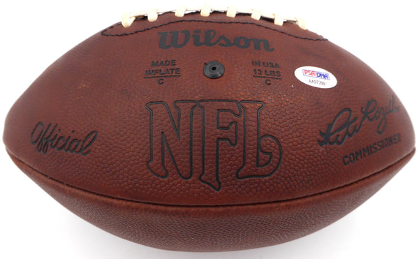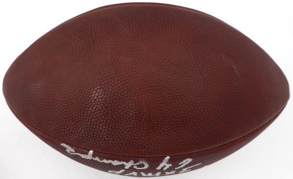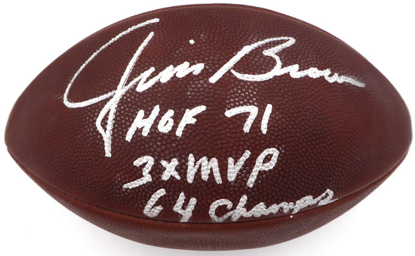 This is an NFL Leather Football that has been hand signed by Jim Brown. This item was inscribed "HOF 71. 3X MVP, 64 Champs." There is an imperfection in the signature as shown. This item has been certified authentic by PSA/DNA and comes with their tamper-proof sticker, but is missing the matching certificate.