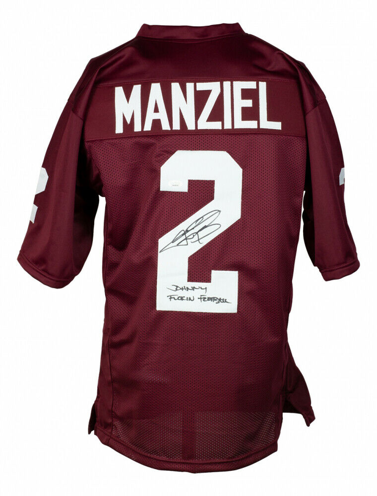 Custom on-field style jersey. Everything is sewn on, size XL. Hand-signed and inscribed in black felt-tip pen by Johnny Manziel. The lot / autograph(s) includes an official James Spence Authentication (JSA) hologram and matching COA for authenticity purposes. The signing of this item was witnessed by JSA.Authentication: JSA COA