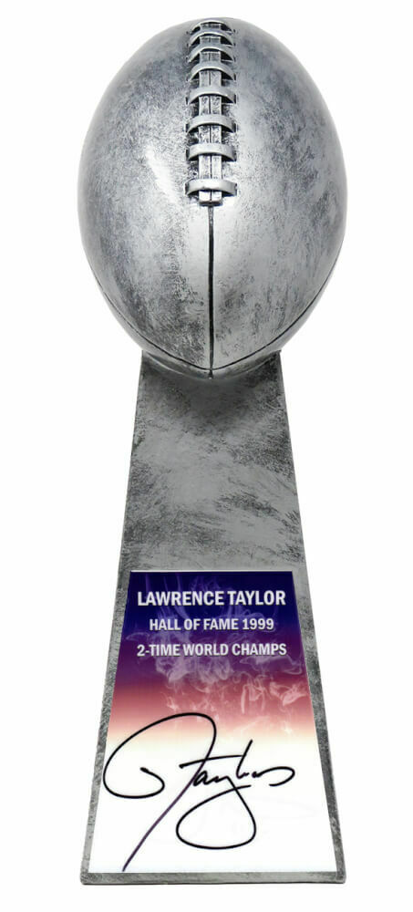 Lawrence Taylor signed football world champion 15 inch replica silver trophy. Item comes with a Schwartz Sports Memorabilia tamper-proof numbered hologram and Certificate of Authenticity which can be verified online.