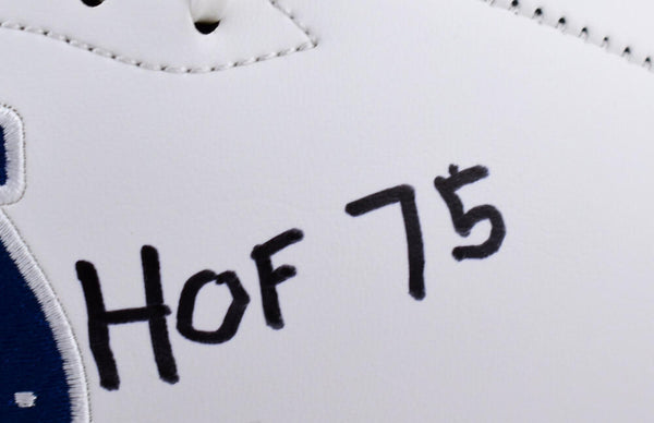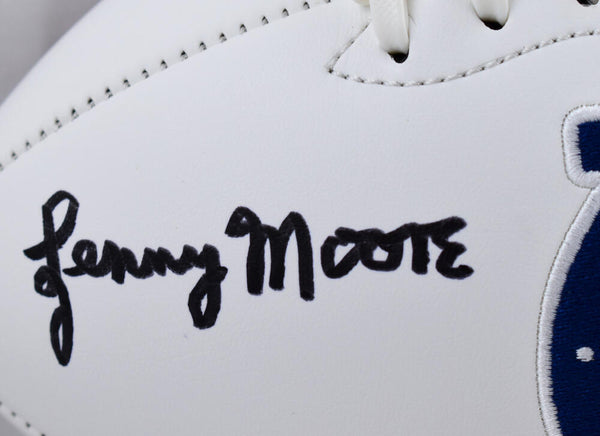 Lenny Moore Autographed Baltimore Colts Logo Football w/ HOF 75 - Beckett W Hologram *Black This is a hand autograph of Lenny Moore on a Baltimore Colts Logo Football and inscribed with HOF 75. This item has a Beckett Witness Authentication, which comes with a Beckett numbered hologram and a QR code for verification. You can view this item on the Beckett Authentication website and it shows when and where the item was signed. It was signed either at a public autograph appearance or a private signing. This is a stock photo of the item. Although you may not receive this exact item, the item you receive is virtually identical and brand new in great shape.