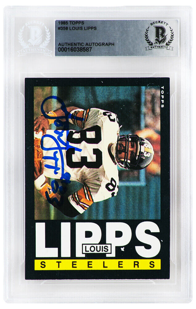 Louis Lipps signed Pittsburgh Steelers 1985 Topps rookie football card #358. The card has been authenticated and encapsulated by Beckett Authentic and the authentication number can be verified online. The image of the item is a stock photo, as we may have multiples of the item in stock. The Slabbed Card you will receive will be of the card described. (Same grade, Same authentication) You may or may not receive the exact Beckett serial number on the slab label shown in image.