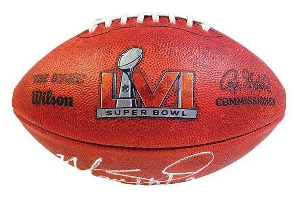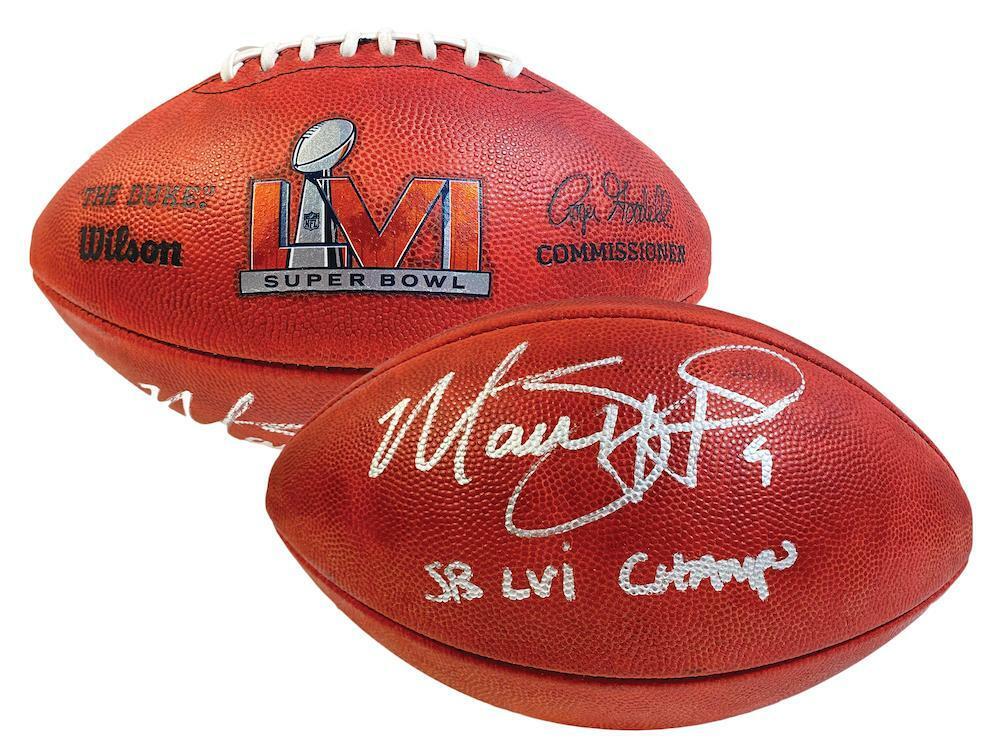 This authentic official Super Bowl LVI football has been personally hand-signed by Matthew Stafford with the added inscription "SB LVI Champs." It is officially licensed by the National Football League and comes with an individually numbered, tamper-evident hologram from Fanatics Authentic. To ensure authenticity, the hologram can be reviewed online. This process helps to ensure that the product purchased is authentic and eliminates any possibility of duplication or fraud.The autograph includes an official Fanatics hologram and matching COA for authenticity purposes.Comes with a tamper-evident hologram from Fanatics AuthenticatedOfficially licensed by the NFL MONEY BACK GUARANTEE! If for any reason you are not completely satisfied with the quality or authenticity of your purchase, we will gladly give you a full refund or exchange, whichever you prefer up to 30 days after purchase. Please feel free to e-mail us with any questions. Thank you. Authenticator Pre-Certified Authenticator: Fanatics Authenticated History of item: Matthew Stafford has signed this item in the presence of a representative from Fanatics. Describe how you came to possess this item: Super Sports Center is a fully authorized dealer for Upper Deck Authenticated as well as Mounted Memories and Steiner Sports. Other information about you and / or the item: Super Sports Center strives to deliver the most authentic in sports memorabilia from trusted companies like Mounted Memories, Steiner Sports and Upper Deck Authenticated. If it exists, we can find it for you!