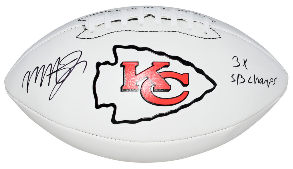Mecole Hardman, star wide receiver for the Kansas City Chiefs, has hand signed this Chiefs white panel logo football at a private signing. He included the inscription "3x SB Champs". This item is authenticated by Beckett Authentication Services and was signed in the presence of one of their representatives. Their tamper-evident hologram featuring a QR code and serial number is on the item. The authenticity can be verified online by entering the serial number or scanning the QR code.Item pictured may not be the exact item you will receive. It will be similar quality, and we guarantee your satisfaction.