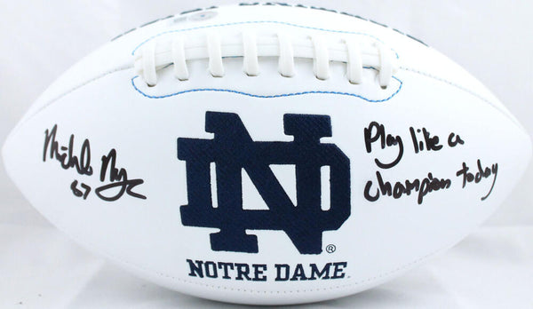 Michael Mayer Autographed Notre Dame Logo Football w/Play Like a Champion-Beckett W Hologram *Black This is a hand autograph of Michael Mayer of the Notre Dame Fighting Irish on a Logo Football. Inscribed with Play Like a Champion. This item has a Beckett Witnessed Authentication, which comes with a numbered hologram and a QR code for verification. You can view this item on the Beckett Authentication website. It was signed either at a public autograph appearance or a private signing. This is a stock photo of the item. Although you may not receive this exact item, the item you receive is virtually identical and brand new in great shape.