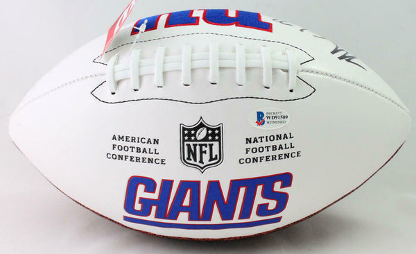 Michael Strahan Autographed New York Giants Logo Football - Beckett W Auth *Simple Back This is a hand autographed Football of Michael Strahan. This is a New York Giants Signature Series Logo Football. This item has a Beckett Witnessed Authentication, which comes with a numbered and a matching Beckett Certificate of Authenticity. You can view this item on the Beckett Authentication website, it shows when and where the item was signed. It was signed either at a public autograph appearance or a private signing. This is a stock photo of the item. Although you may not receive this exact item, the item you receive is virtually identical and brand new in great shape.