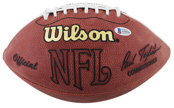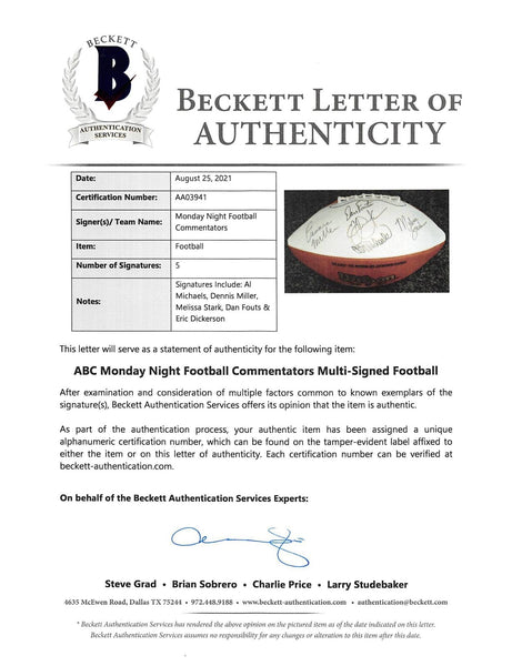 This Autographed White Panel Nfl Football has been Personally Signed by Al Michaels, Dennis Miller, Melissa Stark, Eric Dickerson & Dan Fouts. This item is 100% Authentic to include a Certificate of Authenticity (COA) / hologram by Beckett Authentication Services. The authenticity can be verified on Beckett Authentication Services website. The signature is also authenticated by Upper Deck, and comes with only the hologram, #BAF64881.