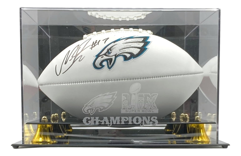 Featured is a Nakobe Dean signed Philadelphia Eagles logo football. This ball has been hand signed by Dean and comes with the PSA/DNA hologram. Included with this ball is a Super Bowl 59 logo deluxe acrylic display case. This ball would make a great addition to any sports memorabilia collection!. SPECIFICATIONS Autographed By: Nakobe Dean Team: Philadelphia Eagles Sport: Football Authentication: PSA/DNA Authentication Services