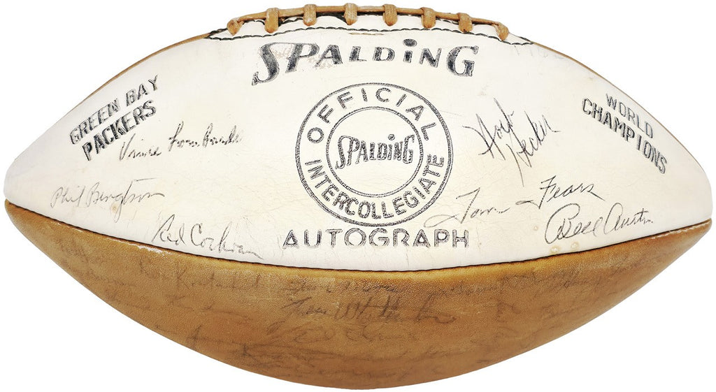 This is a Spalding Leather World Champions Logo Football that has been hand signed by 44 members of the 1962 Green Bay Packers Team. Includes Vince Lombardi, Jim Ringo, Willie Davis, Ray Nitschke, Herb Adderley, Jim Taylor, Henry Jordan, Forrest Gregg, Paul Hornung, Bart Starr, Jerry Kramer, Willie Wood, Tom Fears. Also includes Bill Austin, Herb Hecker, Red Cochran, Phil Bengston, Bob Skoronski, Max McGee, Dave Hanner, Fuzzy Thurston, Bob Jeter, Bill Quinlan, Boyd Dowler, Howie Williams, John Roach, Nelson Toburen, Elijah Pitts, Bill Forester, John Symank, Gary Knafelc, Ed Blaine, Jesse Whittenton, Tom Moore, Ron Kostelink, Ken Iman, Dan Currie, Norm Masters, Gary Barnes, Hank Gremminger, Lew Carpenter and two others. This item has been certified authentic by Beckett Authentication (BAS) and comes with their tamper-proof hologram and matching full-page certificate of authenticity.