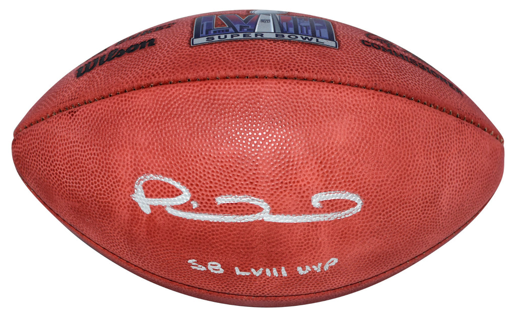 Patrick Mahomes, star quarterback for the Kansas City Chiefs, has hand signed this official Wilson Super Bowl LVIII game football at a private signing. He included the inscription "SB LVIII MVP" with his signature. This item is authenticated by Beckett Authentication Services and was signed in the presence of one of their representatives. Their tamper-evident hologram featuring a QR code and serial number is on the item. The authenticity can be verified online by entering the serial number or scanning the QR code.Item pictured may not be the exact item you will receive. It will be similar quality, and we guarantee your satisfaction.