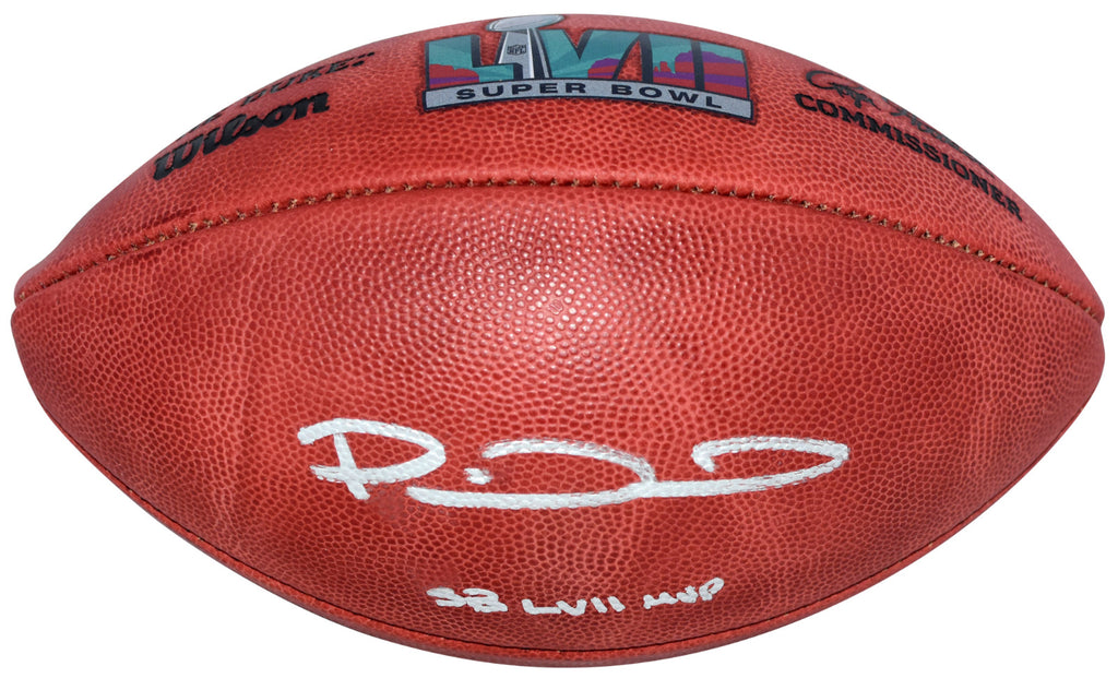 Patrick Mahomes, star quarterback for the Kansas City Chiefs, has hand signed this official Wilson Super Bowl LVII game football at a private signing. He included the inscription "SB LVII MVP" with his signature. This item is authenticated by Beckett Authentication Services and was signed in the presence of one of their representatives. Their tamper-evident hologram featuring a QR code and serial number is on the item. The authenticity can be verified online by entering the serial number or scanning the QR code.Item pictured may not be the exact item you will receive. It will be similar quality, and we guarantee your satisfaction.