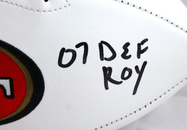 Patrick Willis Autographed San Francisco 49ers Logo Football w/Insc.-Beckett W Hologram *Black This is a Patrick Willis hand autographed San Francisco 49ers Logo Football. Inscribed 07 DEF POY. This item has a Beckett Witnessed Authentication, which comes with a numbered sticker hologram and a QR code for verification. You can view this item on the Beckett website, it shows when and where the item was signed. It was signed either at a public autograph appearance or a Private Signing. This is a stock photo of the item. Although you may not receive this exact item, the item you receive is virtually identical, brand new, and in great shape.