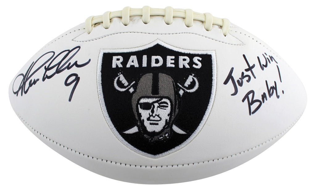 This Autographed White Panel Logo Football with the inscription of "Just Win Baby" has been Personally Signed by Shane Lechler of the Oakland Raiders. This item is 100% Authentic to include a hologram by Beckett Authentication Services. This item will come with the new Beckett Authentication hologram that has a scannable QR code rather than the traditional COA. If you would like to have a COA, you are welcome to reach out to Beckett for a printed certification once you receive your item. This is a BAS Witnessed Protection Program item which means a Beckett Authentication Service representative was present when this item was being signed. We conducted an autograph signing with Shane Lechler where multiples of the same item were signed. While the photographs are representative of this item, the size, placement and strength of the signature may vary. Each item is hand signed, therefore, each autograph is unique. This item can be verified through BAS Witnessed.