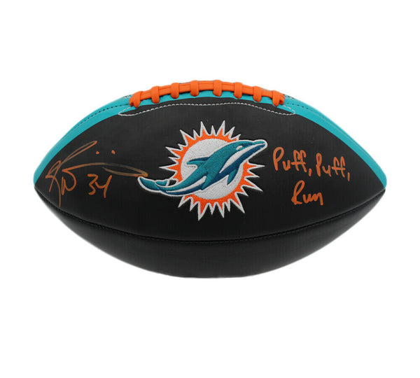 A Miami Dolphins Embroidered Black NFL Football hand signed by Ricky Williams. The item and signature are in excellent condition. In addition to signing his name, Ricky also inscribed "Puff, Puff, Run" on the item. Ricky is a former American football running back who played 11 seasons in the NFL. Ricky played college football for the University of Texas, where he was a two-time All-American and won the Heisman Trophy. Ricky was drafted by the New Orleans Saints before being traded to the Miami Dolphins. He also spent a season with the Baltimore Ravens. AUTHENTICATION: The item is accompanied by a Ricky Williams Exclusive Certificate of Authenticity - Ricky Williams Exclusive Serial Numbered and Databased Hologram - Picture of Ricky from the Signing