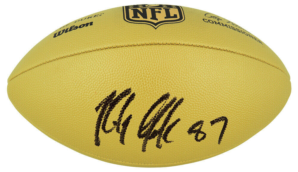 Rob Gronkowski signed Wilson Duke gold metallic NFL full size replica football. Item comes with a Schwartz Sports Memorabilia tamper-proof numbered hologram and Certificate of Authenticity which can be verified online.