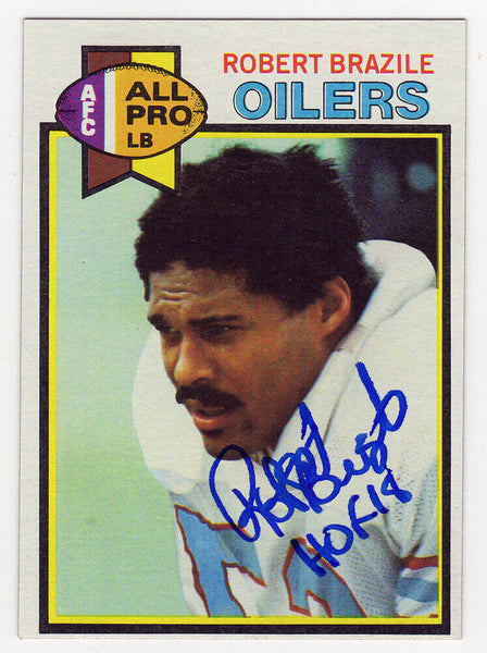 Robert Brazile signed Houston Oilers 1979 Topps football card #192 with 'HOF 18' inscription. Item comes with a Schwartz Sports Memorabilia tamper-proof numbered hologram (on back of physical card) and Certificate of Authenticity which can be verified online.