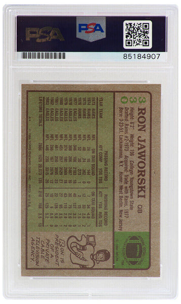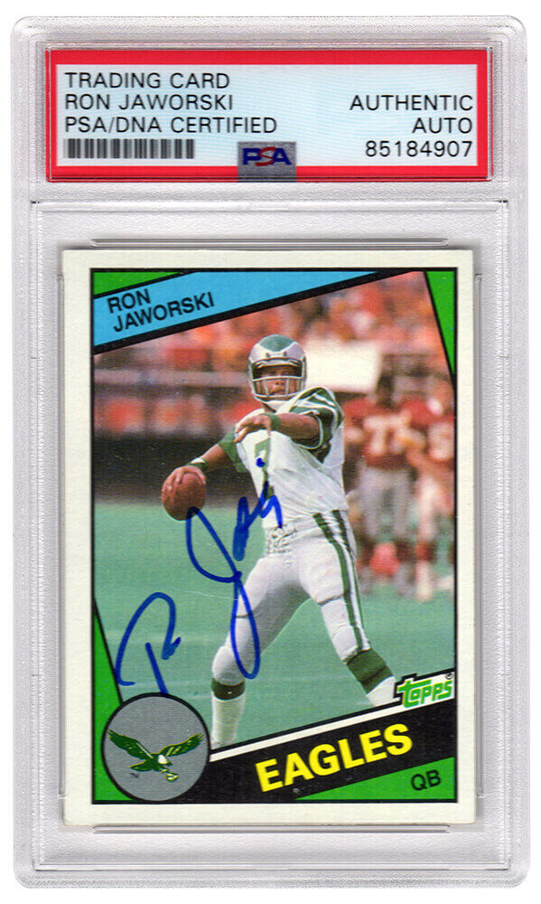 Ron Jaworski Signed Philadelphia Eagles 1984 Topps football trading card #330. The card has been authenticated and encapsulated by PSA/DNA and the number can be verified online.