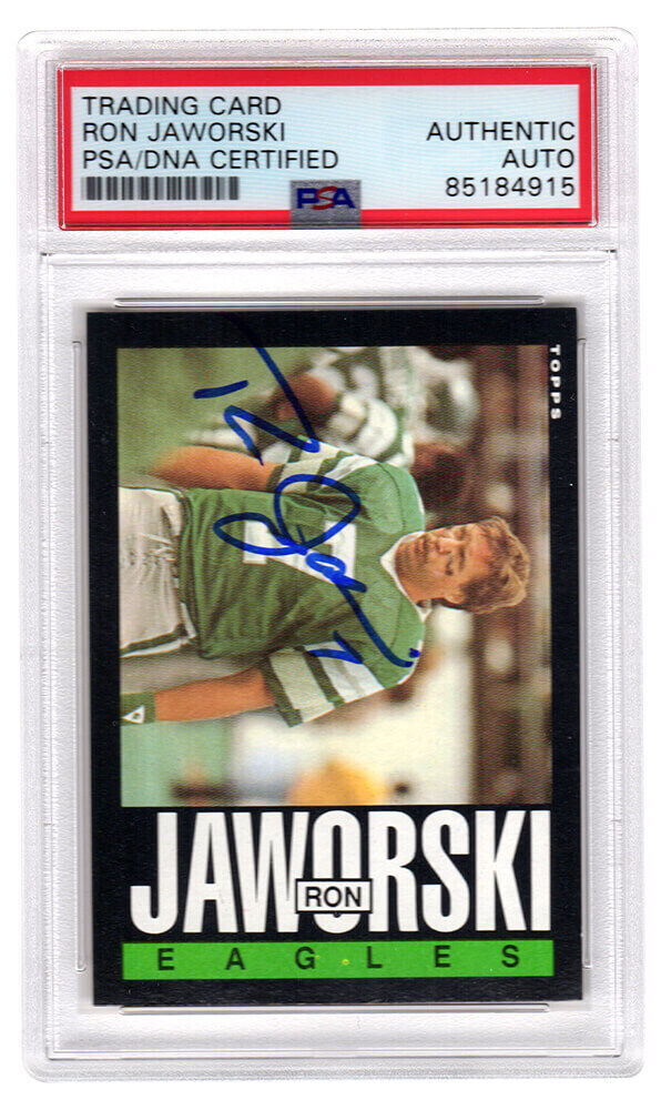 Ron Jaworski Signed Philadelphia Eagles 1985 Topps football trading card #132. The card has been authenticated and encapsulated by PSA/DNA and the number can be verified online.