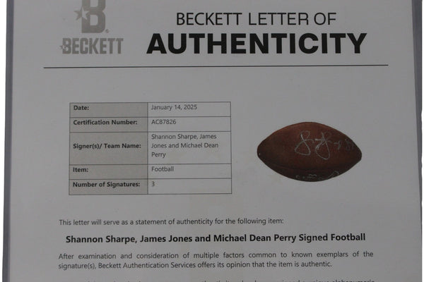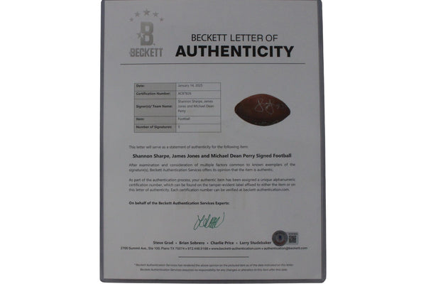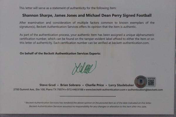 The number in the listing title is just an inventory sku for our records and is not the authentication number. The item pictured is the exact item you will receive, please see photos for condition. This is a Denver Broncos Wilson PeeWee Football that was personally autographed by Shannon Sharpe, James Jones, and Michael Dean Perry. This Ball is being sold As Is due to the bladder not holding air in the football. Includes a certificate of authenticity from Beckett Authentication Services (BAS) and Denver Autographs. FREE SHIPPING within the USA on orders over $10!