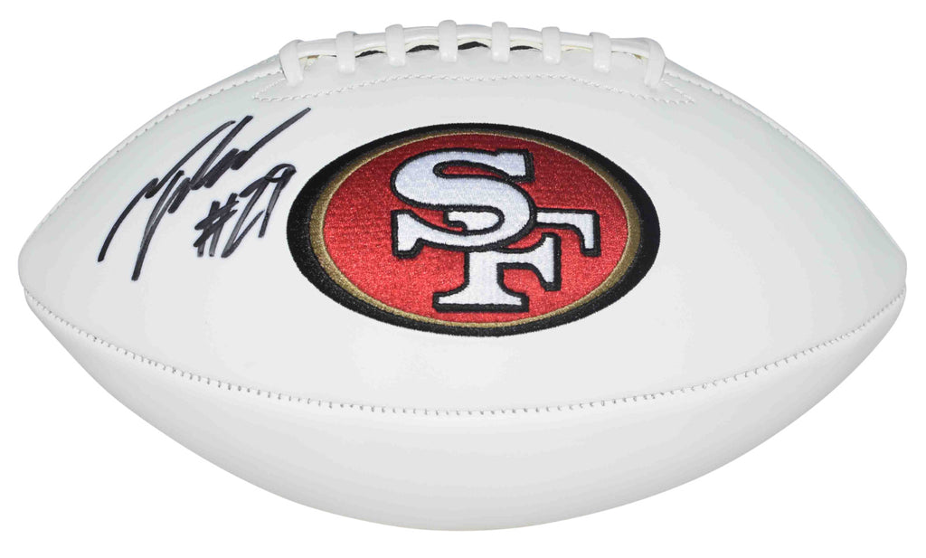 Talanoa Hufanga, All-Pro safety for the San Francisco 49ers, has hand signed this 49ers white panel logo football at a private signing. This item is authenticated by Beckett Authentication Services and was signed in the presence of one of their representatives. Their tamper-evident hologram featuring a QR code and serial number is on the item. The authenticity can be verified online by entering the serial number or scanning the QR code.Item pictured may not be the exact item you will receive. It will be similar quality, and we guarantee your satisfaction.