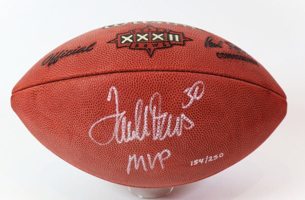 This product is an official Super Bowl XXXII game ball autographed and inscribed by Terrell Davis of the Denver Broncos who was named the game's MVP. The autograph is authenticated by James Spence Authentication (JSA) and comes with a Certificate of Authenticity. This rare and collectible item would be a valuable piece for any football fan or autograph enthusiast, showcasing a piece of NFL history from one of the game's all-time greatest players.
