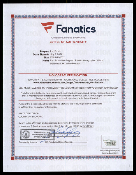 This is a New England Patriots NFL Leather Super Bowl XXXV Logo Football that has been hand signed by Tom Brady. This item has been certified authentic by Fanatics and comes with their tamper-proof sticker and matching full-page certificate of authenticity.
