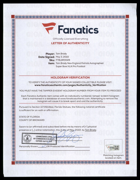 This is an New England Patriots Official NFL Leather Super Bowl XLIX Logo Football that has been hand signed by Tom Brady. This item has been certified authentic by Fanatics and comes with their tamper-proof sticker and full-page letter of authenticity.