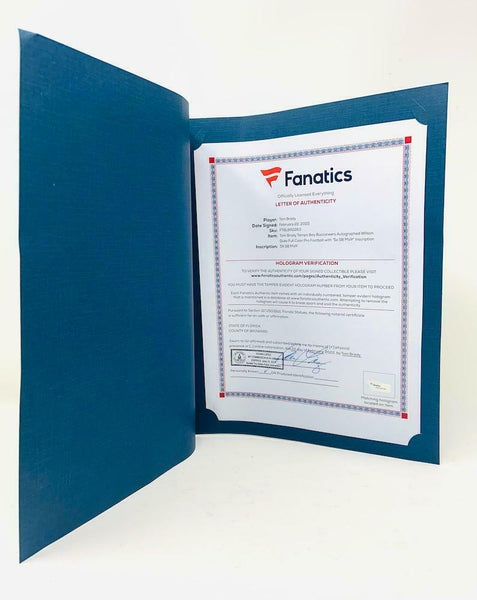 This authentic Duke football has been personally hand-signed by Tom Brady with the inscription "5x SB MVP." It is officially licensed by the National Football League and comes with an individually numbered, tamper-evident hologram from Fanatics Authentic. To ensure authenticity, the hologram can be reviewed online. This process helps to ensure that the product purchased is authentic and eliminates any possibility of duplication or fraud.