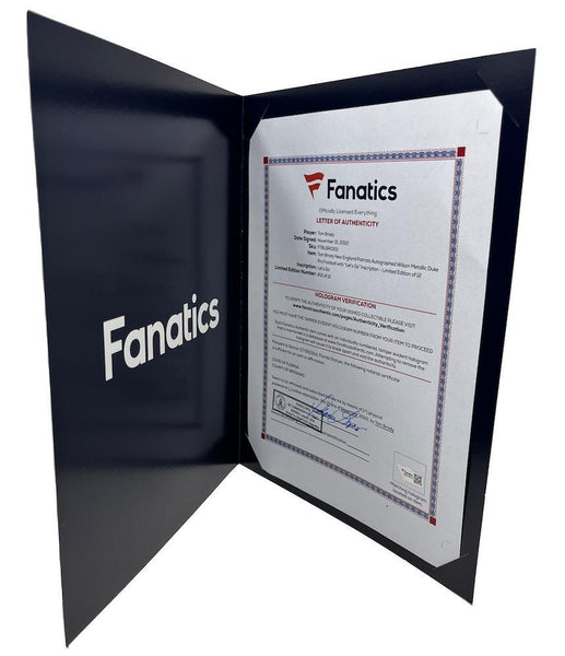 This authentic Duke New England Patriots Metallic Logo football has been personally hand-signed by Tom Brady with the inscription "Lets Go." It is officially licensed by the National Football League and comes with an individually numbered, tamper-evident hologram from Fanatics Authentic. To ensure authenticity, the hologram can be reviewed online. This process helps to ensure that the product purchased is authentic and eliminates any possibility of duplication or fraud.This football is limited to just 12 and the winning bidder will receive a random number from the edition.