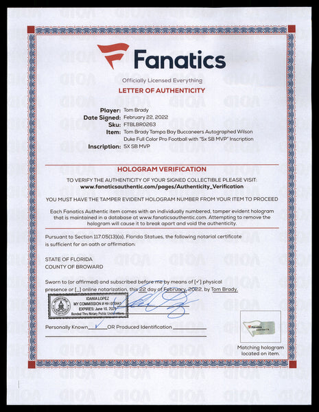 This is an Official NFL Leather Football that has been hand signed by Tom Brady. This item was inscribed "5x SB MVP." Please note, the silver ink on the signature is not fully dry and the signature is delicate to touch. This item has been certified authentic by Fanatics and comes with their tamper-proof sticker and matching full-page letter of authenticity.