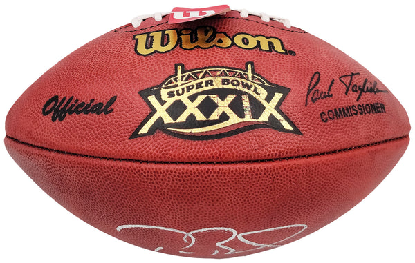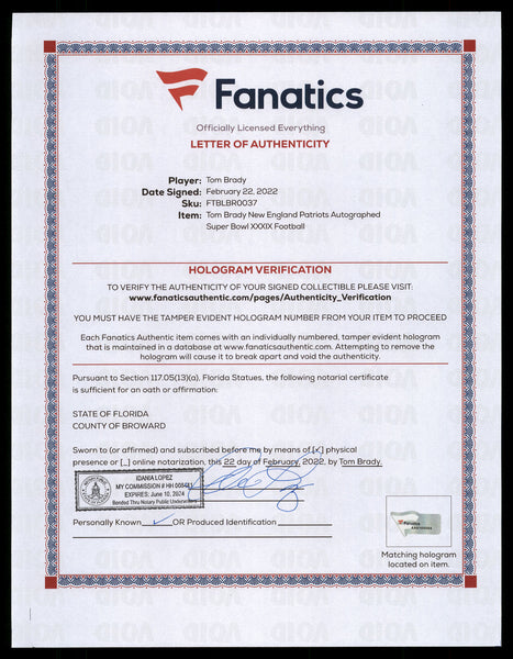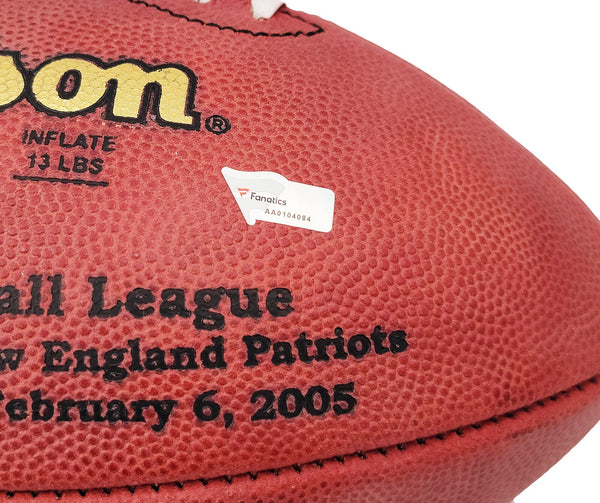 This is an Official NFL Leather Super Bowl XXXIX Logo Football that has been hand signed by Tom Brady. This item has been certified authentic by Fanatics and comes with their tamper-proof sticker and matching full-page certificate of authenticity.A A NOTE: The signature is a little smudged, as shown in the pictures.