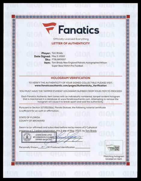This is an Official Super Bowl XXXVI Leather Football that has been hand signed by Tom Brady. This item has been certified authentic by Fanatics and comes with their tamper-proof sticker and the matching full-page certificate of authenticity.