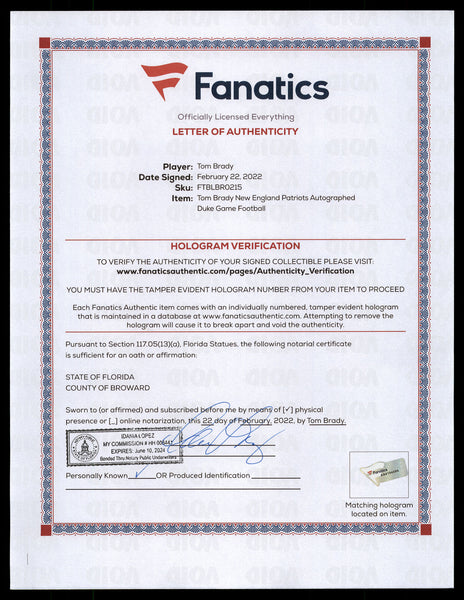 This is an Official NFL Leather Football that has been hand signed by Tom Brady. Please note, the silver ink on the signature is not fully dry and the signature is delicate to touch. This item has been certified authentic by Fanatics and comes with their tamper-proof sticker and matching full-page letter of authenticity.