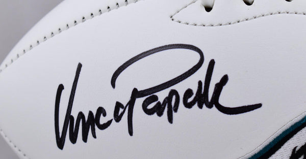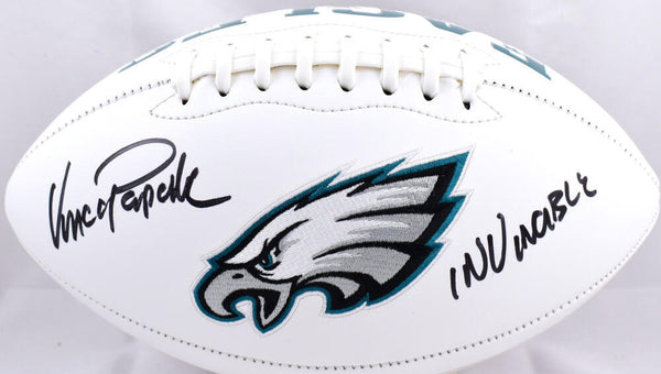 Vince Papale Autographed Eagles Logo Football w/Invincible-Beckett W Hologram *Black This is a hand autograph of Vince Papale on a Philadelphia Eagles Logo Football. Inscribed Invincible. This item has a Beckett Witness Authentication, which comes with a Beckett numbered hologram and a QR code for verification. You can view this item on the Beckett Authentication website, and it shows when and where this item was signed. It was signed either at a public autograph appearance or a private signing. This is a stock photo of the item. Although you may not receive this exact item, the item you receive is virtually identical and brand new in great shape.