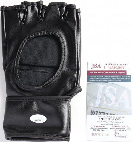 UFC glove has been hand-signed by Georges St-Pierre (HOF).The lot / autograph(s) includes an official James Spence Authentication (JSA) hologram and matching COA for authenticity purposes. The signing of this item was witnessed by JSA.Authentication: JSA COA
