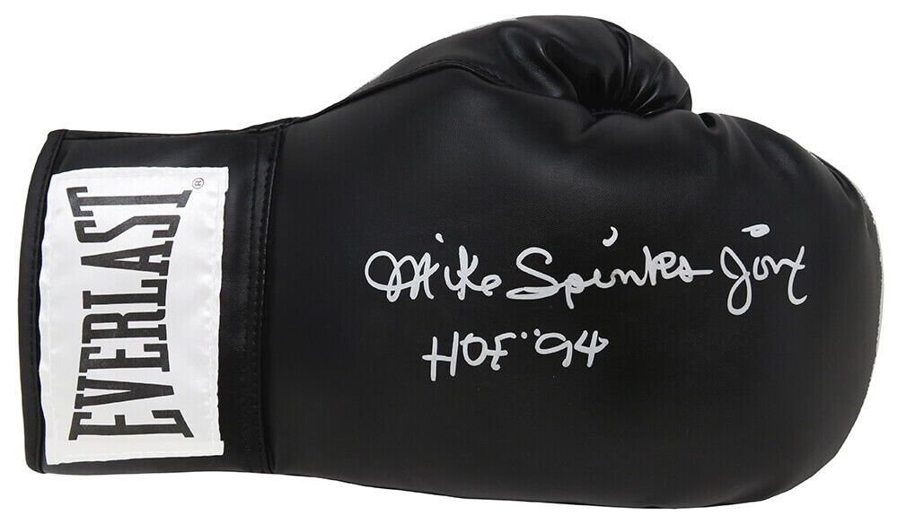 Michael Spinks signed Everlast black boxing glove with 'Jinx' and 'HOF 94' inscriptions. Item comes with a Schwartz Sports Memorabilia tamper-proof numbered hologram and Certificate of Authenticity which can be verified online.