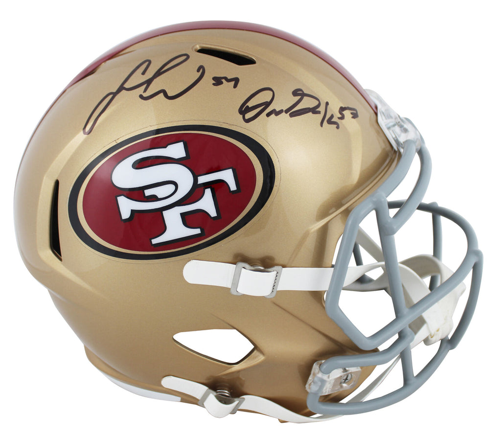 This Autographed Full Size Speed Rep Helmet has been Personally Signed by Fred Warner & Dre Greenlaw of the San Francisco 49ers. This item is 100% Authentic to include a hologram by Beckett Authentication Services. This item will come with an affixed Beckett Authentication Services (BAS) authentication sticker, which includes a scannable QR code to verify authenticity. Please note that Beckett no longer provides serial-numbered COA cards, and the attached BAS sticker will serve as the complete authentication for this item. This is a BAS Witnessed Protection Program item which means a Beckett Authentication Service representative was present when this item was being signed. We conducted an autograph signing with Fred Warner & Dre Greenlaw where multiples of the same item were signed. While the photographs are representative of this item, the size, placement and strength of the signature may vary. Each item is hand signed, therefore, each autograph is unique. This item can be verified through BAS Witnessed.