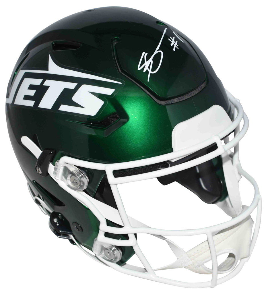 Ahmad "Sauce" Gardner, the #4 overall pick for the New York Jets, has hand signed this Jets Tribute Riddell SpeedFlex full-size authentic helmet at a private signing. This helmet is fully padded inside like the ones worn on the field. This item is authenticated by Beckett Authentication Services and was signed in the presence of one of their representatives. Their tamper-evident hologram featuring a QR code and serial number is on the item. The authenticity can be verified online by entering the serial number or scanning the QR code.Item pictured may not be the exact item you will receive. It will be similar quality, and we guarantee your satisfaction.